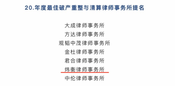 2023年3月21日,LEGALBAND发布了2023年中国法律卓越大奖(China Law Awards)提名名单,炜衡律师事务所凭借出色的业务能力和良好的客户口碑,获得年度最佳破产重整与清算律师事务所提名。